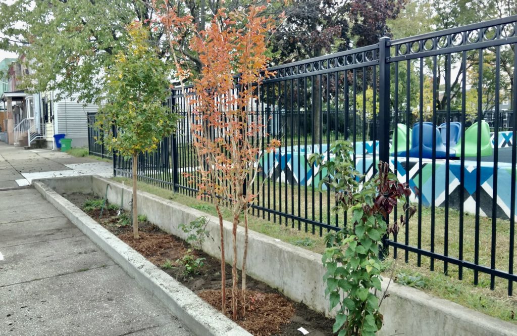 The eight, new, stunning enhanced tree pits planted around the park have trees, flowers, and shrubs inside. As the greenery grows it will create an extended tree canopy between the park and the street, providing cooling shade on the hot pavement in the summer months. The variety of trees planted will burst with color in the fall and display welcoming flowers in the spring – breathing new life into the area surrounding this recently renovated and popular park.